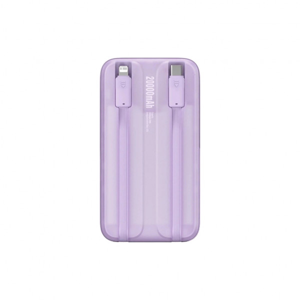 Зовнішній акумулятор Baseus серії Comet ємністю 20 000 мАг та вихідною потужністю 22,5 Вт із вбудованими кабелями USB-C та Lightning.