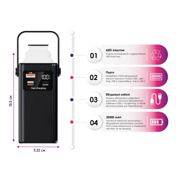 індикатор залишкового заряду; ліхтар; цифровий дисплей; Power Delivery; З вбудованим кабелем; Quick Charge 2.0; Quick Charge 2.1; Quick Charge 3.0