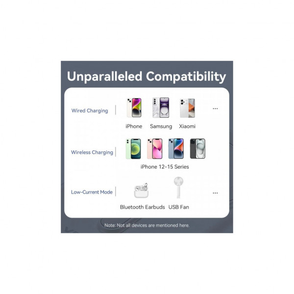 Також у вашому розпорядженні порт USB Type-C з вихідною потужністю до 20 Вт. Використовуйте його також і для поповнення заряду самої УМБ з потужністю до 18 Вт. Батарея підтримує одночасне заряджання двох пристроїв, вона автоматично підбирає оптимальні параметри заряджання для кожного пристрою.