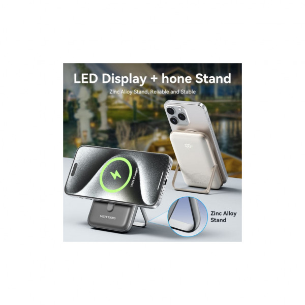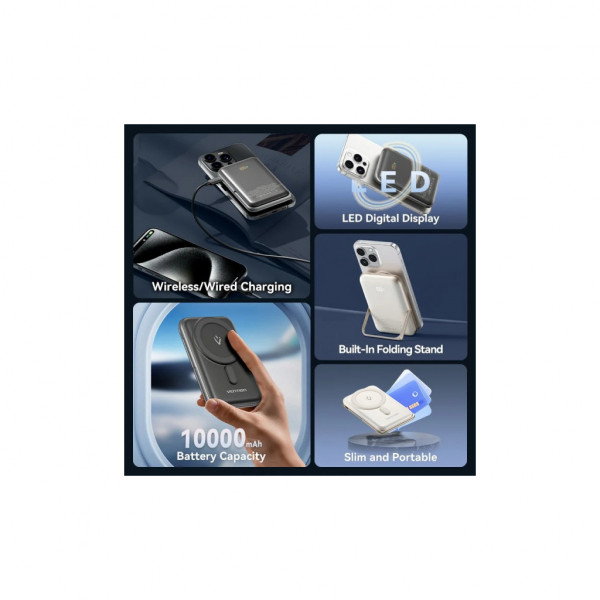 Універсальна мобільна батарея Vention Magnetic Wireless 10000mAh 20W PD швидко та безпечно поповнить заряд пристроїв, сумісних зі стандартом Qi.