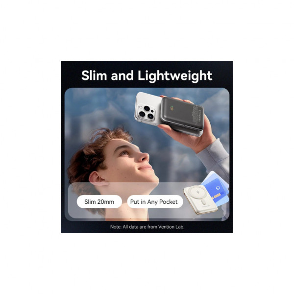 Компактний корпус та невелика вага батареї Vention Magnetic Wireless 10000mAh 20W PD роблять її зручною для користування, зберігання та перенесення. Беріть УМБ на борт літака, вона відповідає стандартним вимогам авіакомпаній до розміру або безпеки.