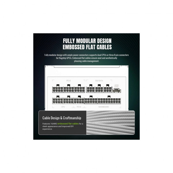 • Ефективність, сертифікована 80+ Gold: Досягає ефективності 90% або вище за типових навантажень, забезпечуючи нижче енергоспоживання, знижений шум та охолодження.
