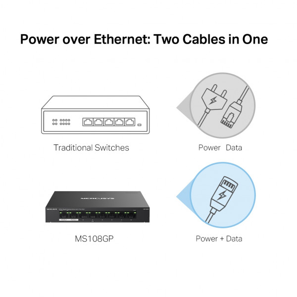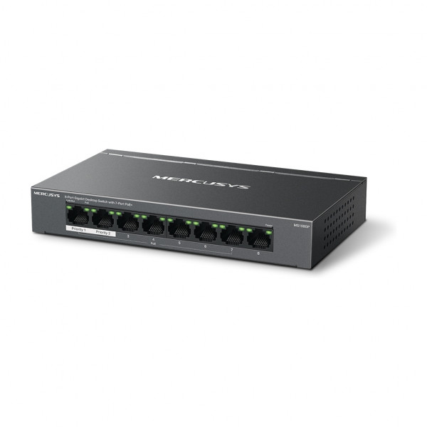 У комутатора MS108GP вісім портів, сім з яких підтримують технологію PoE+ (порти 1–7). Бюджет кожного порту PoE+ складає 30 Вт. Такі порти дозволяють подавати живлення до пристроїв стандартів 802.3af/at. Загальний бюджет PoE 65 Вт знадобляться в різних сценаріях. Наприклад, при розгортанні системи відеоспостереження в офісах та гуртожитках. Технологія PoE дозволяє подавати живлення на точки доступу, IP-телефони, комп'ютери, відеореєстратори та ряд інших пристроїв.
