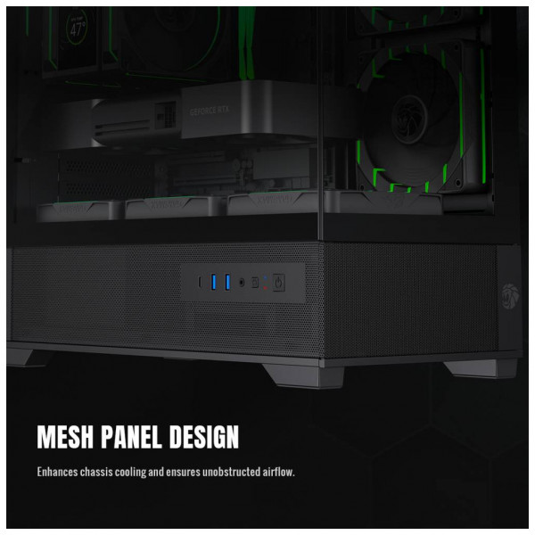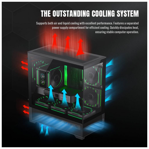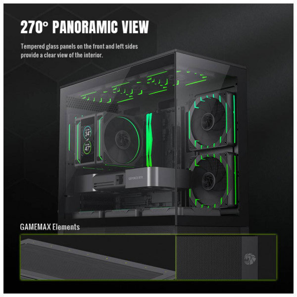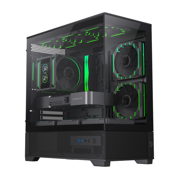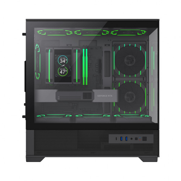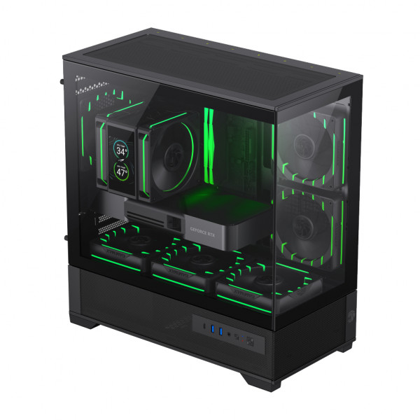 Передня та ліва бокова панелі виконані із загартованого скла, що забезпечує широкий 270° огляд внутрішніх компонентів. Це дозволяє продемонструвати підсвічування, систему охолодження та сучасну відеокарту у всій красі.