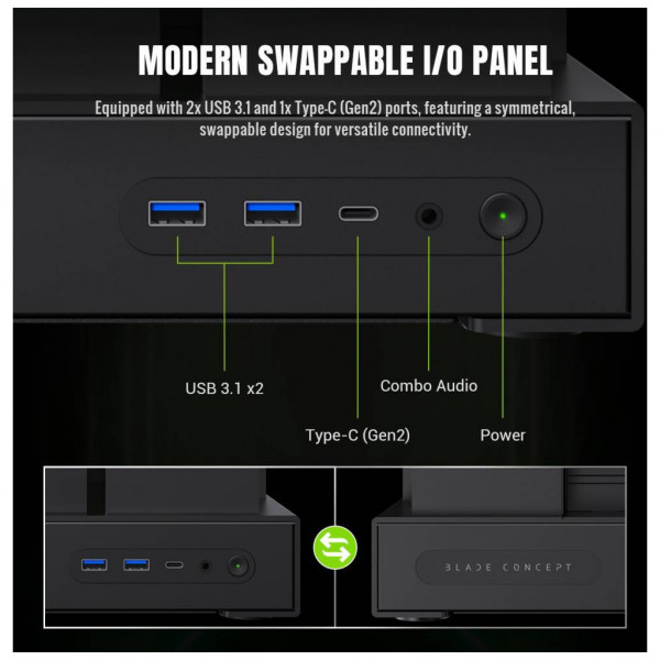 - Сучасна панель введення/виведення з 2 портами USB 3.1 та 1 портом Type-C (Gen2) із симетричним дизайном із можливістю заміни.