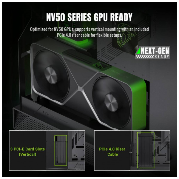 - Підтримка відеокарти серії NV50 з підтримкою вертикального монтажу відеокарти за допомогою кабелю-розподільника PCIe 4.0, що входить до комплекту, для універсальних налаштувань.