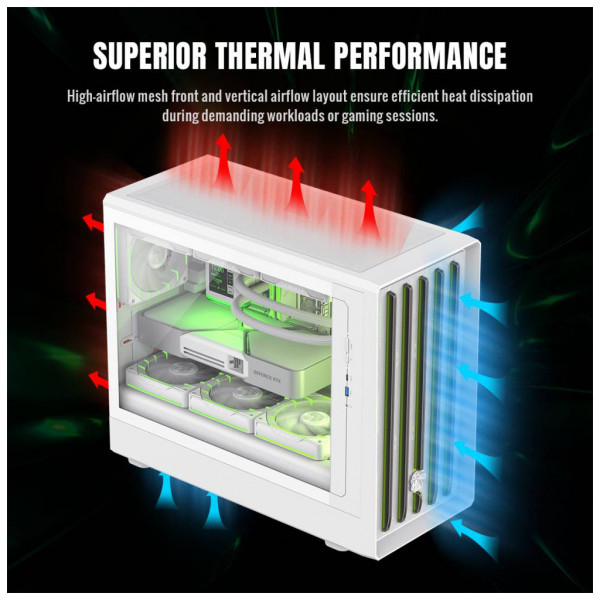 - Потужне охолодження – фронтальна панель із сталевої сітки та вертикальний дизайн повітряних каналів забезпечують стабільний повітряний потік.