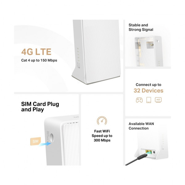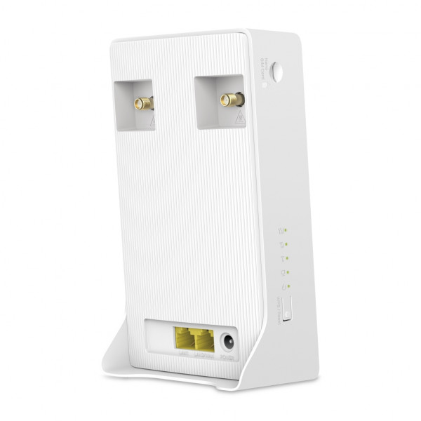 MERCUSYS MB110-4G – бездротовий маршрутизатор N300 із підтримкою 4G/LTE. Забезпечує швидкість Wi-Fi до 300 Мбіт/с (2,4 ГГц), має порт WAN/LAN Fast Ethernet та окремий LAN-порт, слот для Nano-SIM і роз’єми для зовнішніх антен.