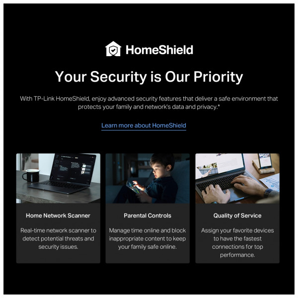 Сумісність з EasyMesh дозволяє гнучко формувати мережу Wi-Fi у всьому будинку, додаючи додаткові маршрутизатори або підсилювачі сигналу. TP-Link HomeShield гарантує захист вашої мережі, даних та конфіденційності. Налаштування стало простішим завдяки додатку Tether, який дозволяє швидко та легко налаштувати мережу та забезпечити потужний сигнал у вашому домі.