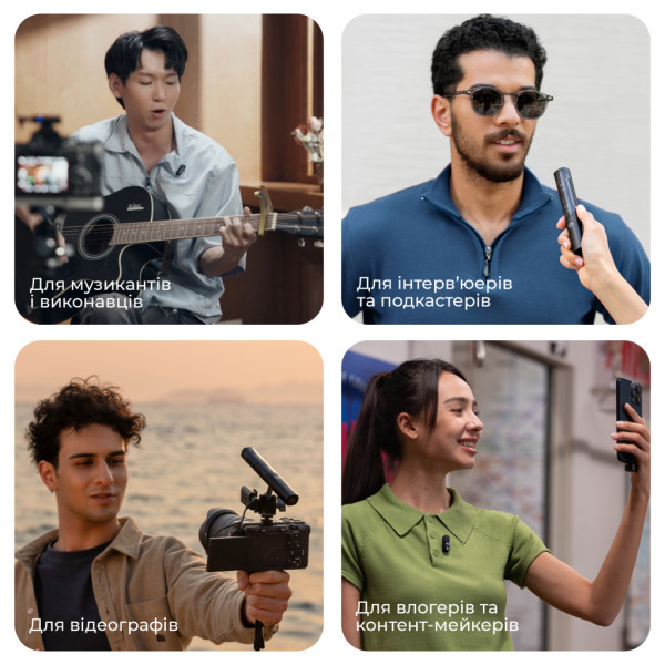 - Петличний мікрофон: Надзвичайно легкий (лише 7 г) і компактний. Ідеально підходить для інтерв'ю, відеоблогу або потокового мовлення, залишаючись непомітним та не відволікаючи увагу від кадру.