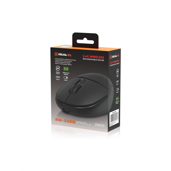 Real-El RM-335W — це сучасна Бездротова оптична миша, що вдало поєднує ергономічний дизайн, точне керування та надійну роботу. Використання енергоефективної технології зв’язку 2.4 ГГц забезпечує стабільне з’єднання без затримок і розривів, дозволяючи комфортно працювати на відстані до 10 метрів від комп’ютера. Відсутність дротів робить робочий простір акуратним і зручним.