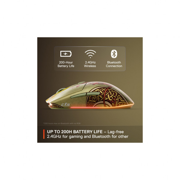 Одного повного заряду акумулятора SteelSeries CS2 Dragon Lore Wireless RGB мишки вистачає до 200 годин безперервної гри з Bluetooth підключенням.