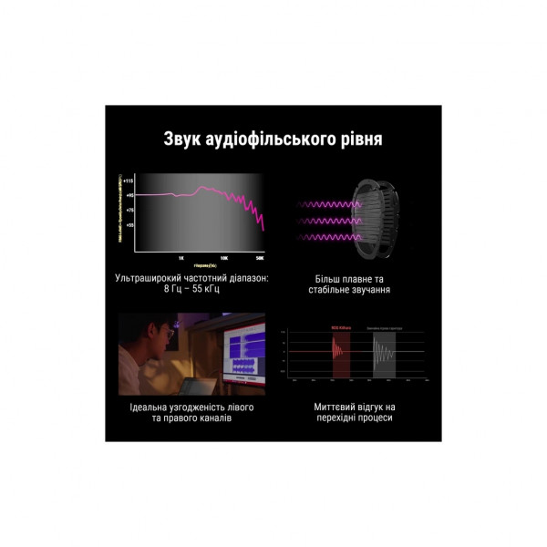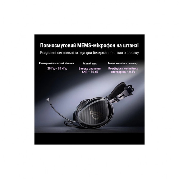 - Відкрита конструкція: простора, природна звукова сцена з чітким розділенням низьких, середніх і високих частот для покращення просторового сприйняття.