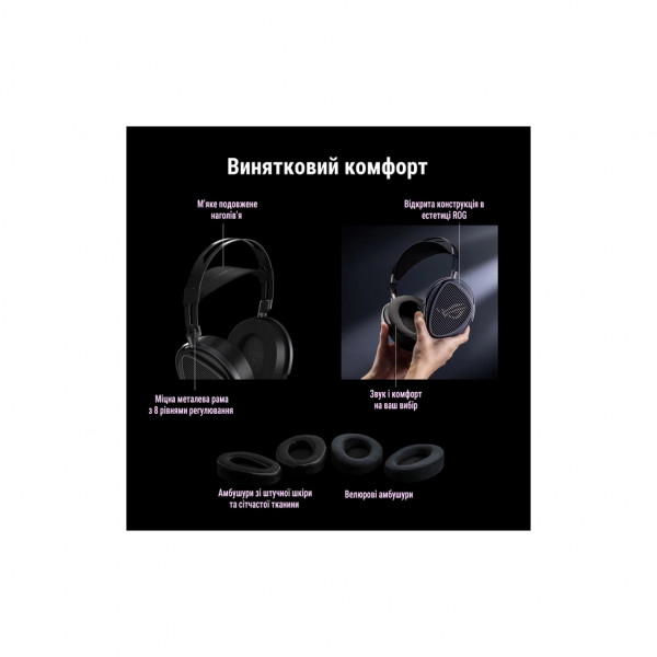 Відкрита конструкція покращує циркуляцію повітря і зменшує втому при прослуховуванні. Великі овальні чашки навушників підходять для різних форм і розмірів вух, забезпечуючи тривалий комфорт, а продуманий кут нахилу чашки урівноважує силу притиску і мінімізує тиск на щелепу. Завершує образ точно оброблена металева пластина з алмазним огранюванням і фірмовими деталями ROG.