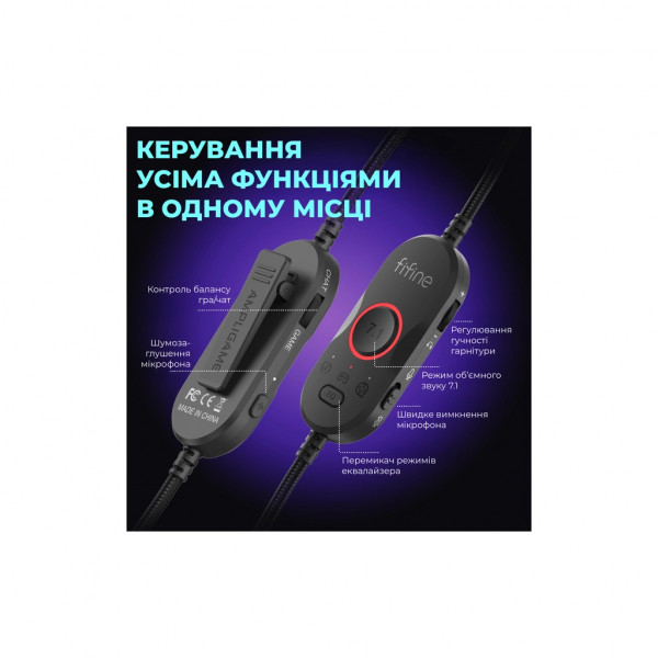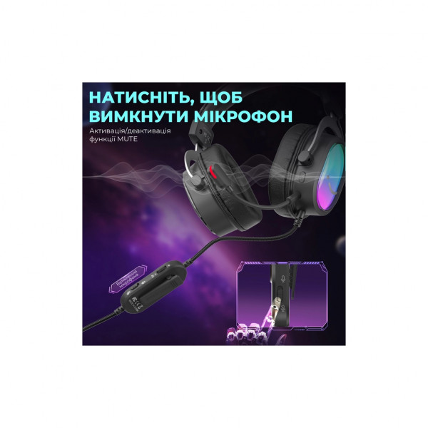 Управління гарнітурою інтуїтивно зрозуміле та зручне. За допомогою вбудованого регулятора гучності ви легко налаштуєте загальний рівень звуку. А підсвітка з 11 RGB-ефектами дозволить персоналізувати ваш девайс та створити неповторну атмосферу. Обирайте між статичним кольором, динамічним градієнтом або ефектом дихання, щоб гарнітура ідеально вписалася в вашу геймерську установку.