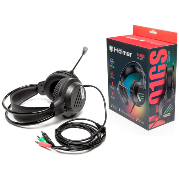 Ігрові навушники Hölmer H-01GS: Потужний звук та яскравий стиль Hölmer H-01GS - це дротові ігрові навушники, розроблені для геймерів, які цінують чистий звук, глибокі баси та комфорт під час тривалих ігрових сесій. Поєднання великих динаміків та яскравої RGB-підсвітки робить їх ідеальним вибором для будь-якого ігрового сетапу. Ключові переваги для занурення у гру: Потужний звук (50 мм HIFI динаміки) Навушники оснащені великими 50 мм HIFI динаміками з посиленим магнітним звучанням. Вони забезпечують широкий діапазон частот (20 - 20 000 Гц), дозволяючи чітко чути кроки ворога, вибухи та діалоги. Яскрава RGB-підсвітка Додайте динаміки своєму ігровому вигляду! Вбудована RGB-підсвітка підключається через окремий USB-порт і підкреслює ігровий дизайн, створюючи потрібну атмосферу. Універсальне підключення для ПК та ноутбуків Навушники ідеально підходять для настільних комп'ютерів завдяки двом окремим 3.5 мм портам (для мікрофона та звуку) та окремому USB-порту для живлення підсвітки. Вони також сумісні з ноутбуками, планшетами та телефонами. Комфорт для тривалого геймінгу Великі, м'які амбушюри зі шкірозамінника PU повністю охоплюють вуха, забезпечуючи звукоізоляцію та комфорт. Регульоване наголов'я дозволяє ідеально підлаштувати розмір під себе. Чітка комунікація Навушники оснащені всеспрямованим (Omnidirectional) мікрофоном. Його висока чутливість (-40 дБ) та якісне співвідношення сигнал/шум забезпечують чітку та надійну передачу голосу під час координації в командних іграх. Почуйте перемогу. Обирайте Hölmer H-01GS!