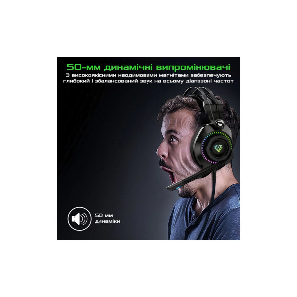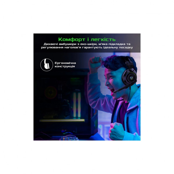 - Комфорт і легкість: Повітропроникні амбушури з екошкіри, м'яка підкладка на дужці, регулювання наголівя й мікрофона гарантує ідеальну посадку для будь-якого геймера.