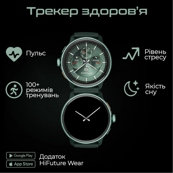 - “НіFuture Wear” застосунок на Google Play та App Store: Завантажуй додаток для синхронізації годинника, управління повідомленнями, відстеження показників та налаштування різноманітних функцій.