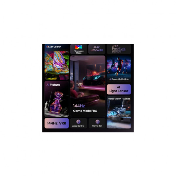 HDR10+; Game bar; AI Picture; Dolby Atmos; VRR; Dolby Vision IQ; ALLM; Total HDR Solution; HDR10+ Adaptive Dolby Vision HDR; Gaming in Dolby; AI Sports Mode; AI 4K Upscaler; AI Smooth Motion; AI Light Sensor; AI Scenario; Panel Refresh Rate 144 Гц; AI HDR Upscaler; WiSA SoundsSend; 144 Гц Game Mode PRO; 240 High Refresh Rate; AMD FreeSync/G-sync; HDR 10+ Gaming