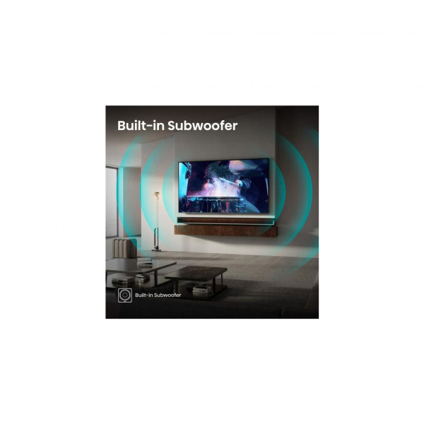 Вбудований у телевізор сабвуфер забезпечує глибокі низькі частоти. Відчуйте гулке звучання в кожній сцені — від ледь уловимих музичних ритмів до гучних екшн-блокбастерів. Пориньте в новий вимір звуку.