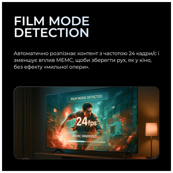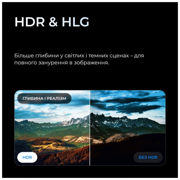 Система звуку 2×12 Вт із підтримкою Dolby Atmos, Dolby Digital, Dolby Vision, HDR, HLG і Upscaling 4K створює просторове, глибоке звучання та реалістичне зображення з ефектом присутності.