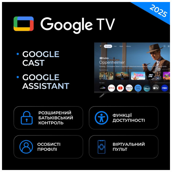 Телевізор працює на інтелектуальній платформі Google TV, що відкриває доступ до широкого вибору розваг: Netflix, YouTube, Megogo, Prime Video та інших популярних сервісів. Підтримуються Google Cast, голосове керування та керування зі смартфона, що робить користування максимально зручним.