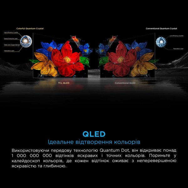 QD-Mini LED від TCL поєднує в собі переваги технологій QLED і OLED, перетворюючи традиційне підсвічування в освітлення, близьке до точності на рівні пікселів. У ній також використовується провідна в світі технологія QLED, що забезпечує контрастність і колірну гаму, порівнянну з OLED, а також більш високу пікову яскравість і тривалий термін служби. Це технологія майбутнього для великих дисплеїв.